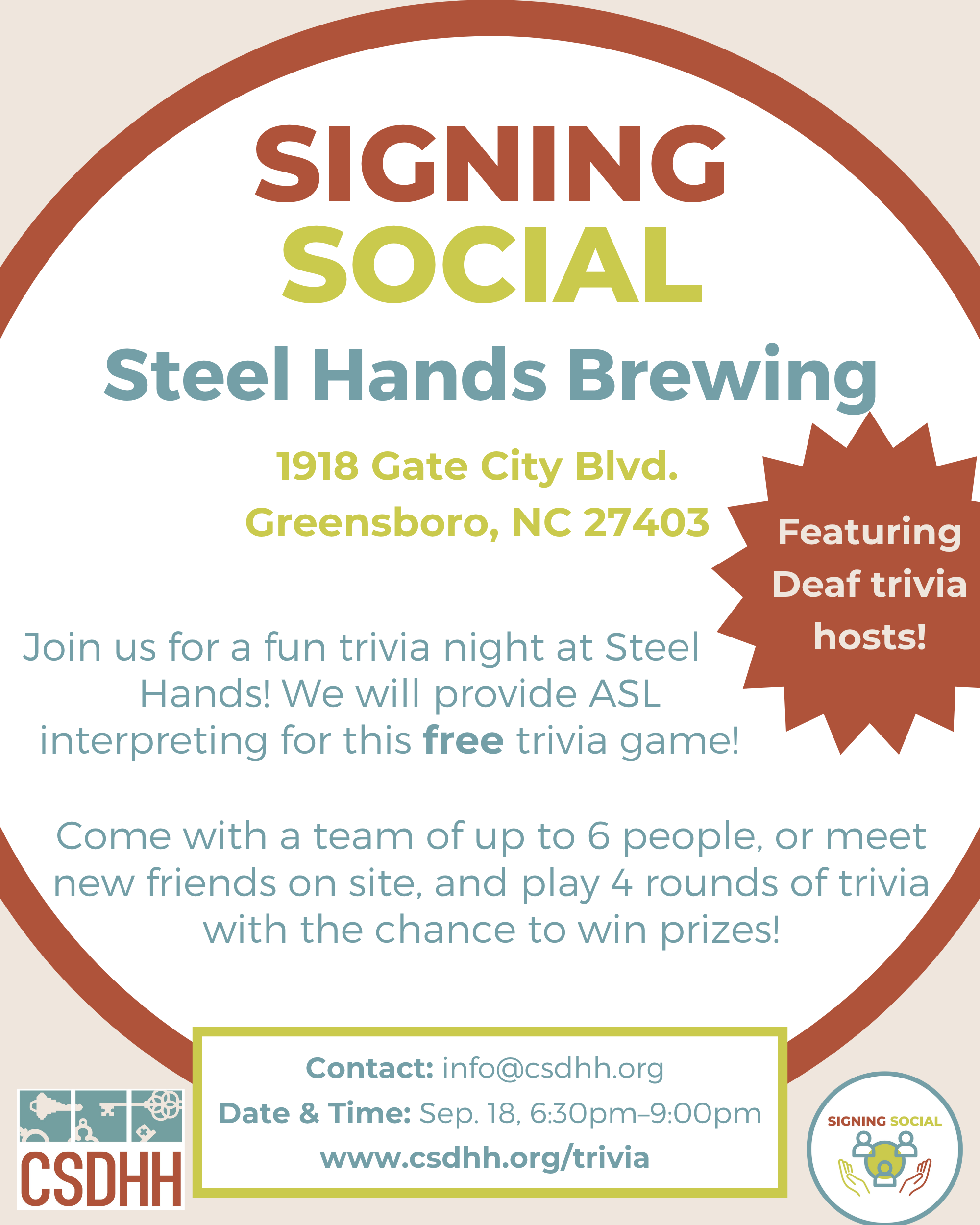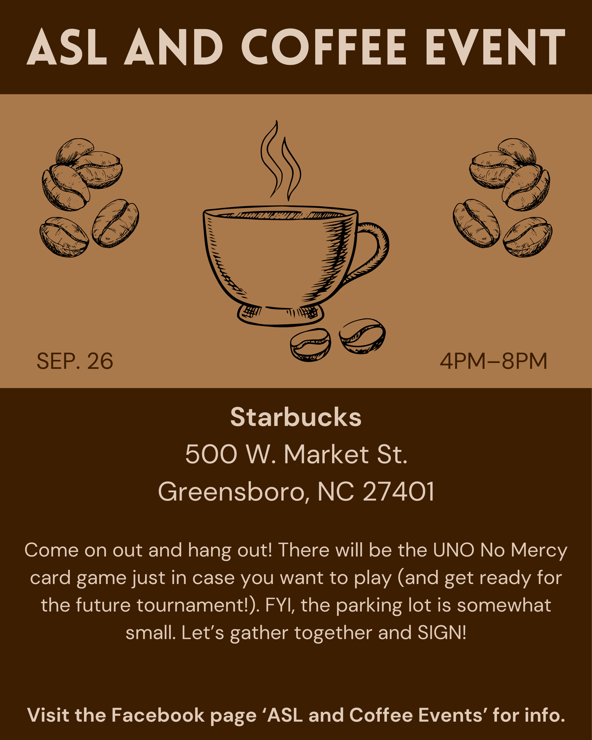 All levels of signers welcome! No voicing, please; please respect the space we are using. Appreciate any help to clean up before we leave.