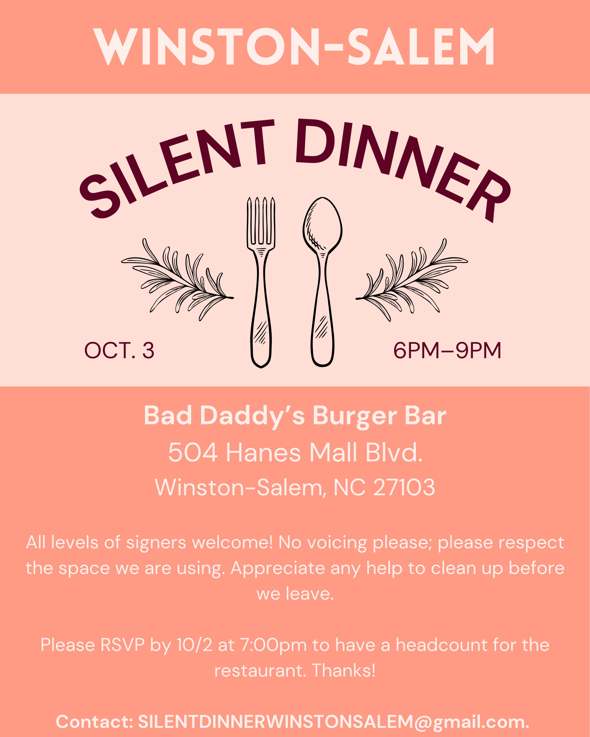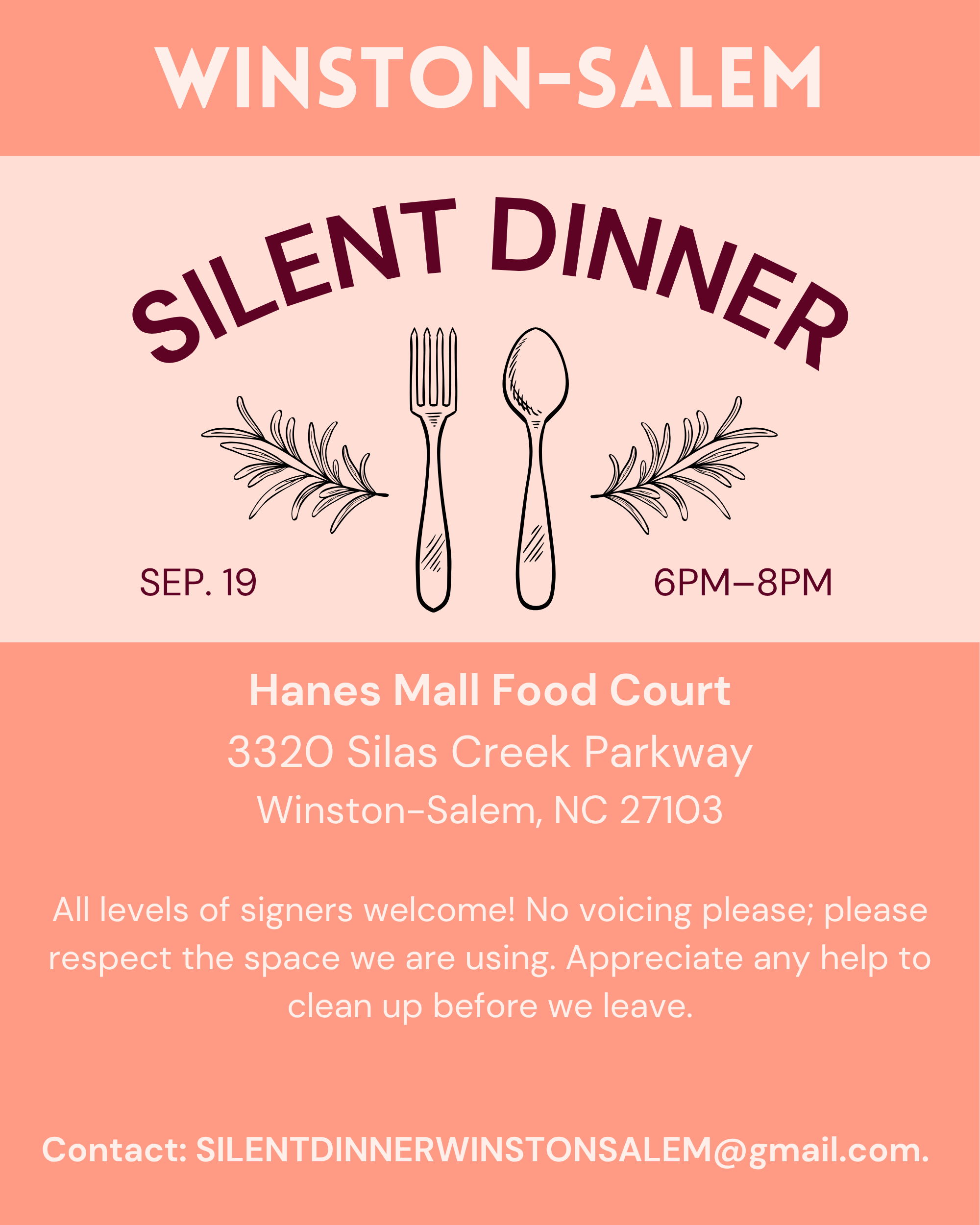 Winston-Salem will have a Silent Dinner at the Hanes Mall Food Court, October 17, 6pm–8pm.